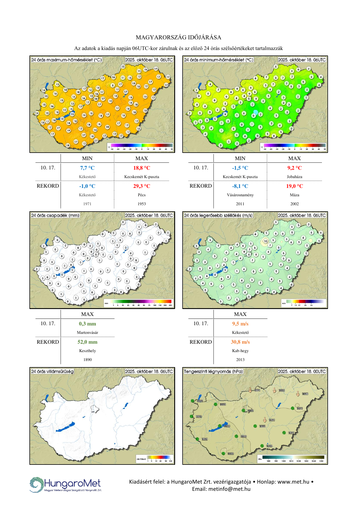 A meteorológiai elemek OMSZ által mért napi értékei ezentúl kontúrtérképeken jelennek meg, de továbbra is tartalmaznak konkrét számértékeket, a korábbinál jóval több állomásról. A térképek alatt táblázatos formában feltüntetjük a napi szélsőértékeket és az abszolút napi rekordadatokat. Az eddigiektől eltérően a napi (24 órás) adatok egységesen, 06 és 06 UTC közötti időszakot fednek le – nagyobb összhangban a nemzetközi gyakorlattal.